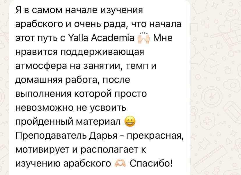Все наши педагоги имеют многолетний опыт преподавания с практикой в ведущих ВУЗах России. В Yalla Academia преподаватель - это не только учитель, но и ментор, который поможет вам преодолеть все трудности, связанные с изучением языка.